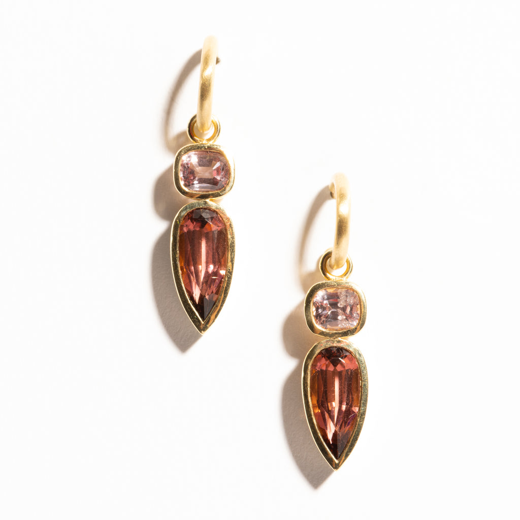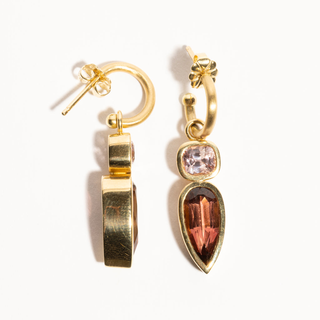 Bezel set shades of pink spinel and tourmaline removable drop placed on a small satin finished gold hoop earring